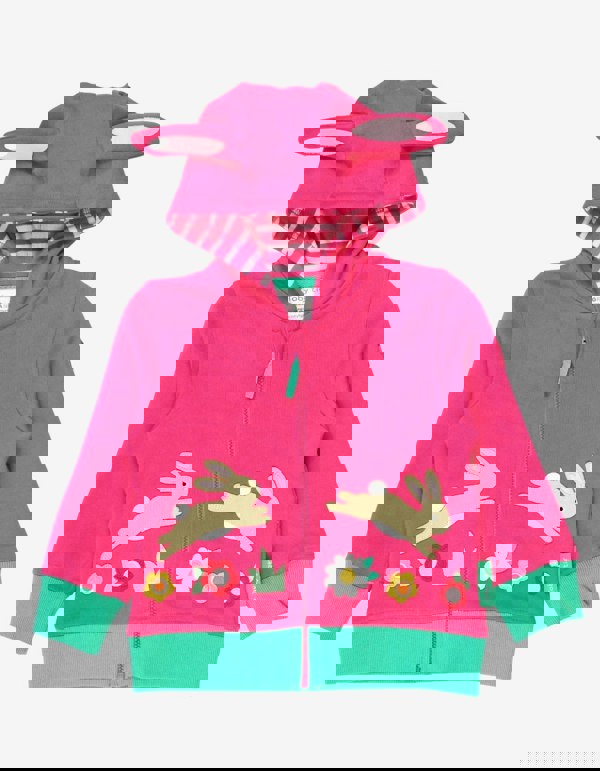 This pink hoodie featuring a bold-green trim features all sorts of fun details, including a bunny-eared hood, softly stitched appliques and a contrasting stripy lining, all in soft, organic cotton.