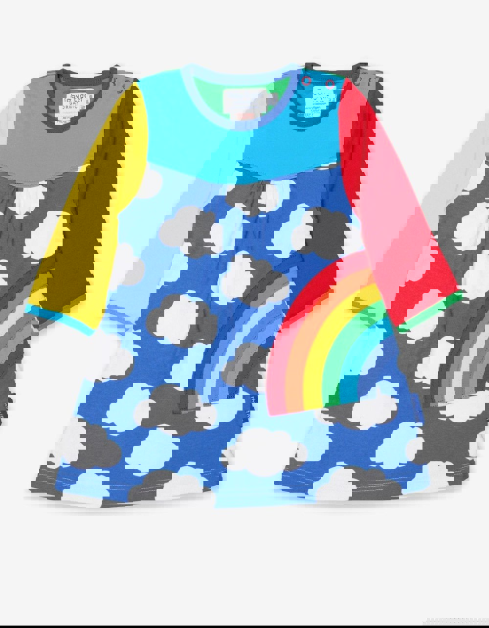 Sing the colours of the rainbow with this super stylish applique dress. While you may not find the pot of gold at the end of the rainbow, your little treasure will love this! Our beautiful sky blue fabric is 100% certified organic and super soft on the skin. And for sizes in 6-12 months and 1-2 years, poppers on the side of the neck make changing as easy as can be.