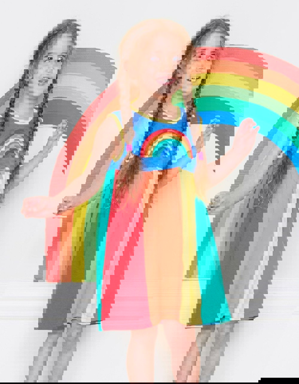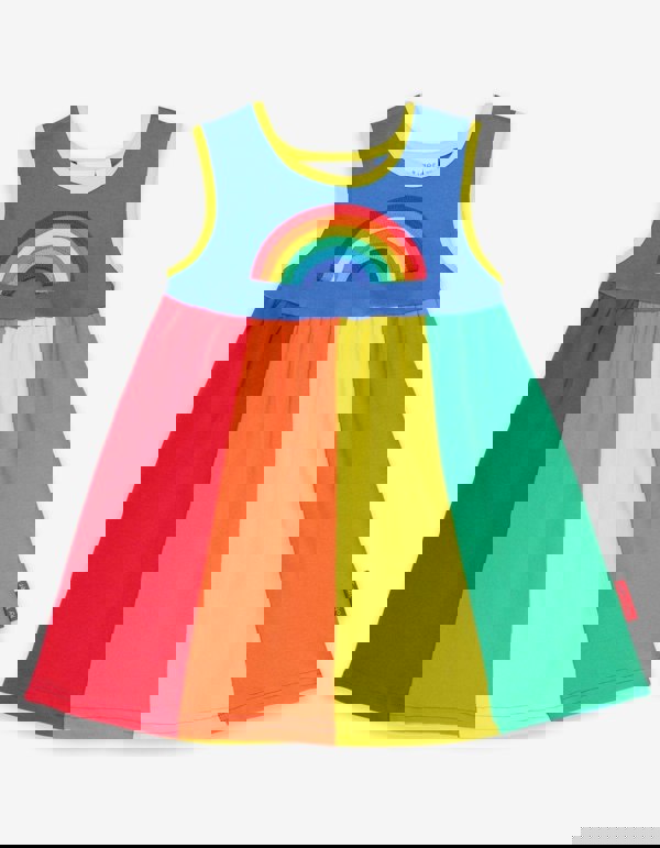 Get ready to rock the party in this full skirt rainbow applique organic cotton dress. With a rainbow panel skirt and contrasting neckline and arm trim, the soft gathers at the waist make it perfect for twirling. Plus, our super soft 100% certified organic cotton will keep your little one cool as they glide around.