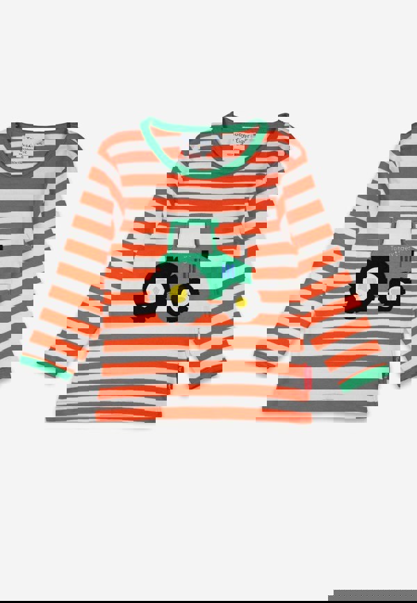 Get ready to be the coolest farmer in town with our Organic Orange Tractor Applique Long-Sleeved T-Shirt! This playful t-shirt features an orange and white striped design and a fun interactive lift-the-flap detail that reveals the hidden farmer. Made with organic materials, it's not only stylish but also environmentally friendly. Yee-haw!