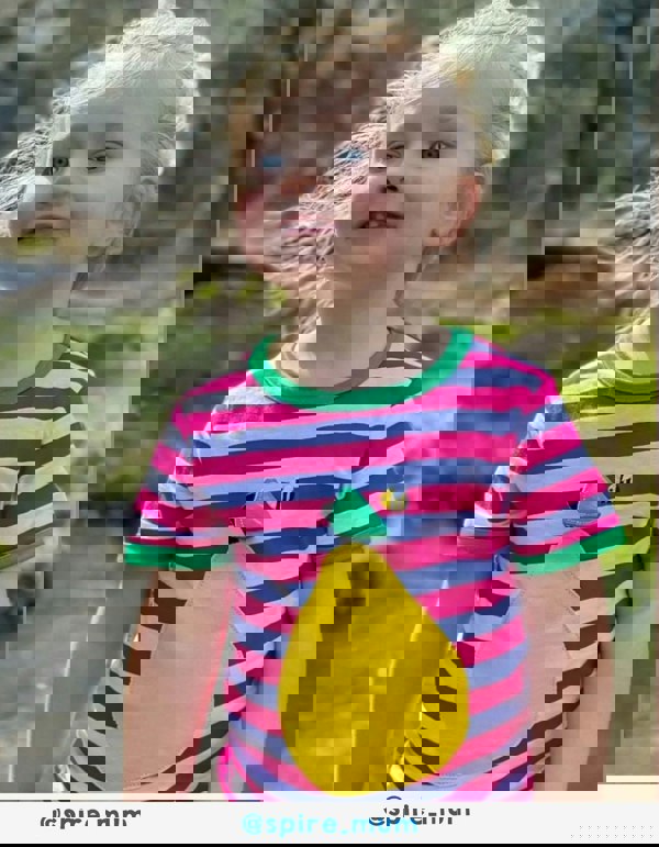 Stay cool and comfy while also giving Mother Nature some love with this organic pear applique t-shirt. Your little one will be buzzing with style in the pink and white striped tee that sports a buzzing bee revealed from the flapping green leaf atop a yellow pear applique. Say goodbye to boring tees and hello to this playful and environmentally-friendly option! Looking for more Pears? We have a full collection of matching dresses, yoga pants and babygrows in this fun and fresh design.