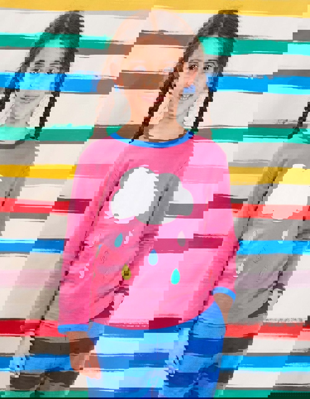 Let it rain colour! Every cloud should sprinkle bright and colourful raindrops - just like this super soft raindrop cloud applique organic T-shirt. Team with a pair of organic joggers for a fab and fun outfit. Are you a fan of this look? Check out our entire organic childrenswear Magical Mix-Up collection online at Toby Tiger.
