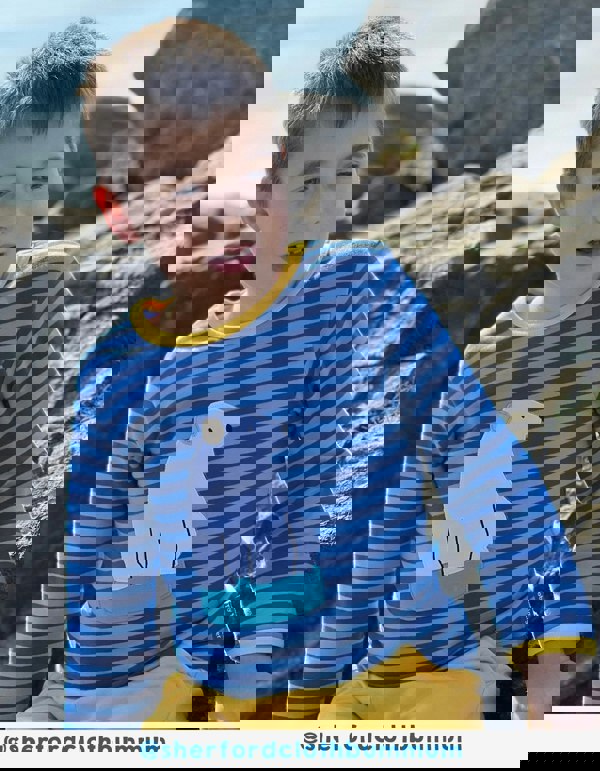 Your child will look adorable and stay warm this winter with our multi-blue striped long-sleeved t-shirt! The bright yellow trim and cuddly polar bear applique make it an absolute must-have. Not to mention, the handy popper fastenings on our smaller sizes make changing times a breeze! Get ready for those cooler months ahead with this comfy and stylish shirt. The durable construction of this shirt means that it will last long beyond the winter season, ready for the next chilly day. With so much fun and style, your child will always be ready for a wintry adventure! Check out the full Toby Tiger Arctic collection for more polar bear-themed clothing.