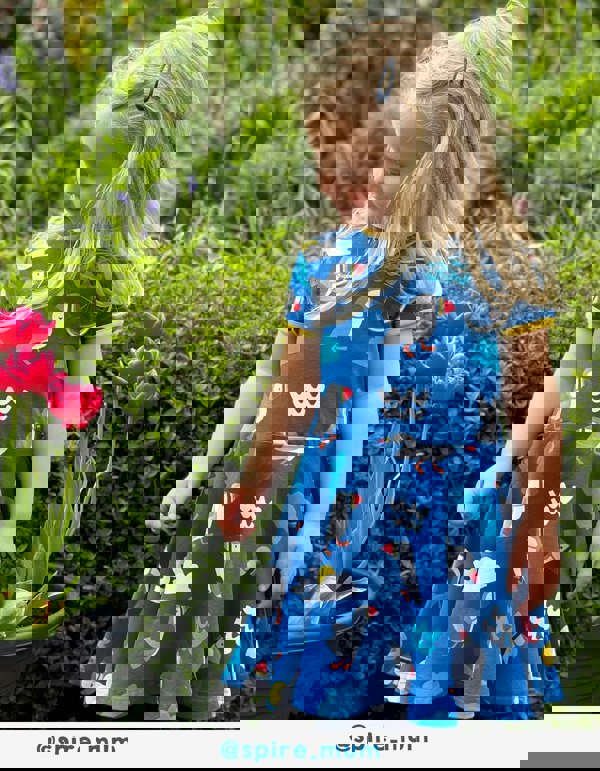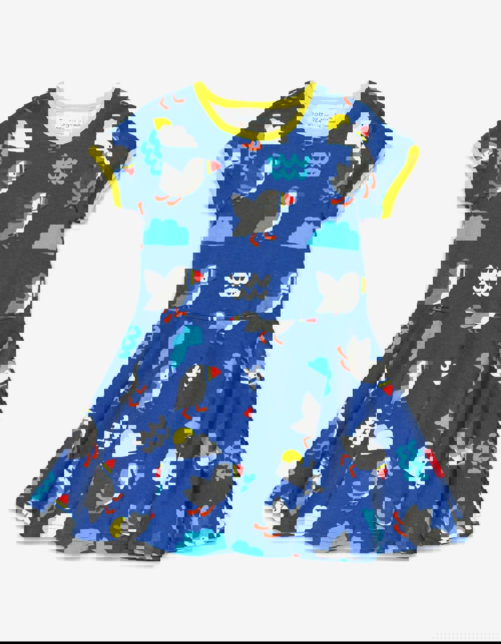 Get your little one's fashion flying high with this groovy Toby Tiger Organic Puffin Print Skater Dress! Featuring a vibrant yellow border, flowy skirt, and adorable cloud/wave design, they'll be the coolest kid in town (or on the shore!). Grab this effortless dress today - it's easily cleanable in the washing machine at 30°C - worry-free! Take a look at the full Puffin collection for more matching outfit choices.
