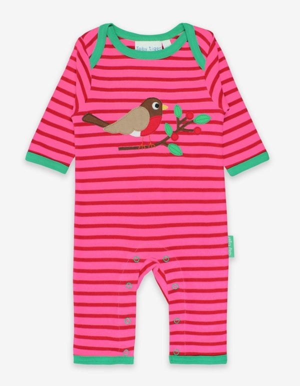 A little birdy told us it's time for bed. Let our seasonal Robin help! Happily perched on our super soft organic cotton, this baby sleepsuit is the perfect recipe for sleep, with an easy envelope neckline and popper fastenings for a stress-free bedtime routine. Love our little pal? Check out our full Robin organic childrenswear collection online at Toby Tiger.