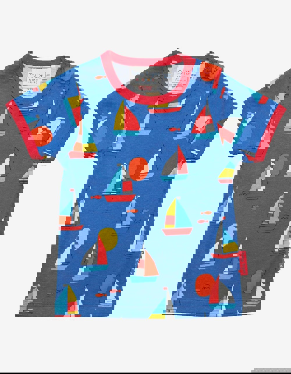 Ahoy there! Step on board for one of the most colourful, organic kids summer T-shirts. Colourful boats bob along the deepest blue organic cotton with a stylish, bold red trim - and can you spot a fish or two? Little nipper sizes come with neck poppers for easy-breezy changing. Embrace this look with matching yoga pants, shorts and even baby essentials online at Toby Tiger. Check out our Sailboat collection!
