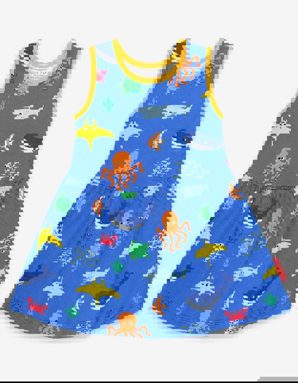 Dive into summer with our ocean-inspired short sleeve organic summer dress. Perfect for whirling and twirling, our super soft 100% certified organic cotton keeps little ones cool as they glide around to show off the deep-sea greats. Love life under the sea? Dive into our world of ocean-inspired organic clothing for kids!