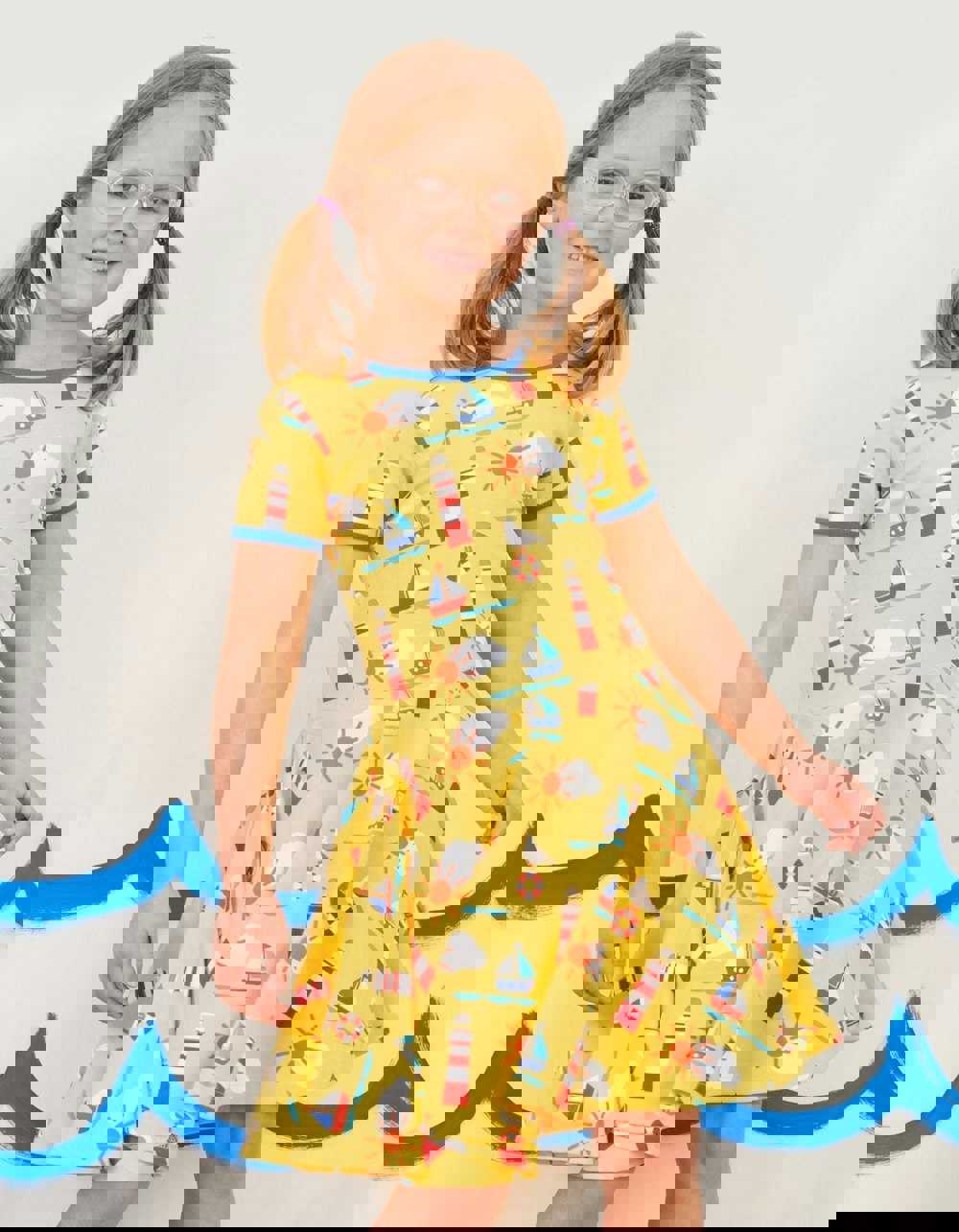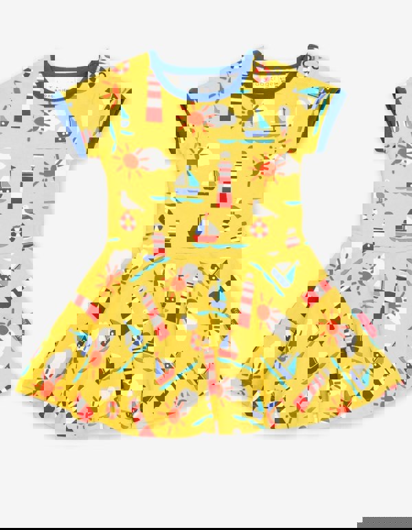 Go on, give us a twirl in this seaside-inspired organic cotton skater dress! Made for spinning and whirling, it's designed in super soft 100% GOTS-certified organic cotton, with added neck poppers on smaller sizes for easy-peasy changing. Love our seaside vibes? Check out our full organic childrenswear Seaside collection online at Toby Tiger.