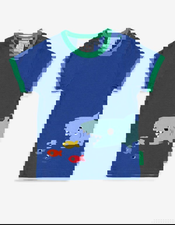 Our super soft applique shark is hungry - will she catch these super-fast fish on this short-sleeved T-shirt? This deep-blue sea fabric is made from 100% certified organic cotton - lovely and soft on delicate skin - while the green trim adds a lovely finishing touch. Our smaller sizes have neck poppers to help things can go swimmingly at changing time. Love life under the sea? Dive into our ocean-inspired organic clothing for kids online.