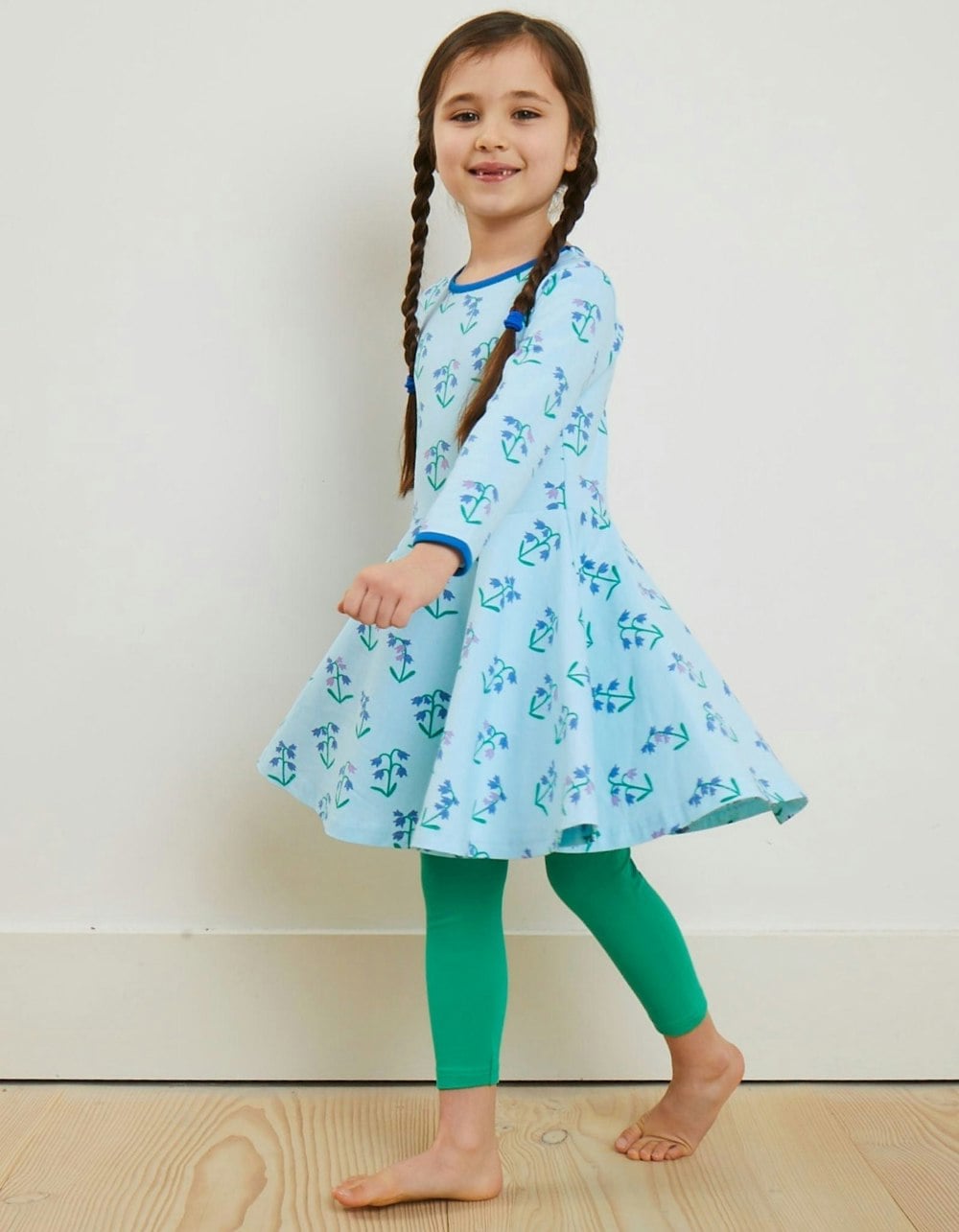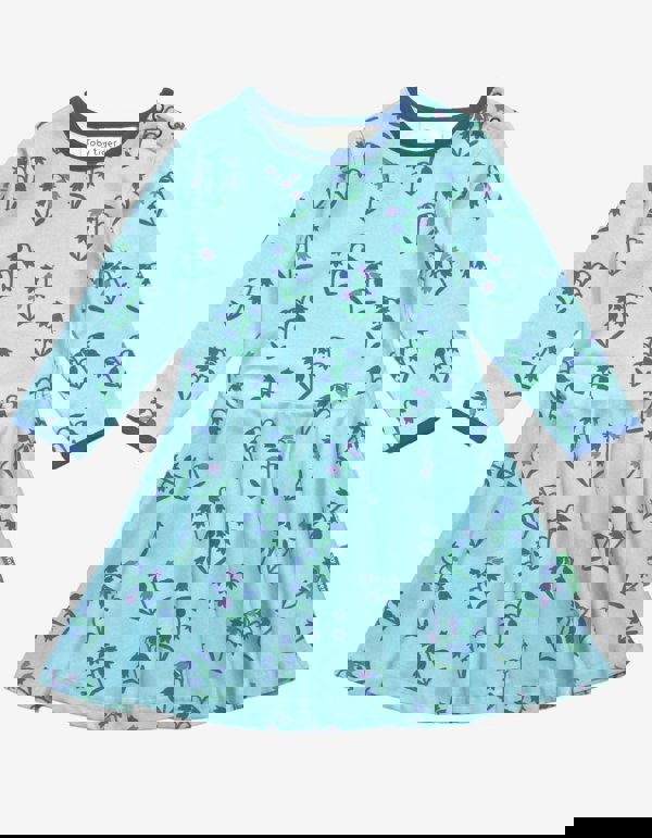 Colourful bluebells among pastel blue make this long-sleeved organic kids' skater dress a spring and summer fave in pure organic cotton that's super soft on the skin and a full skirt that's perfect for a twirl or two. Add a pair of our bright organic leggings on chillier days - find them online. Check out our full Spring collection!