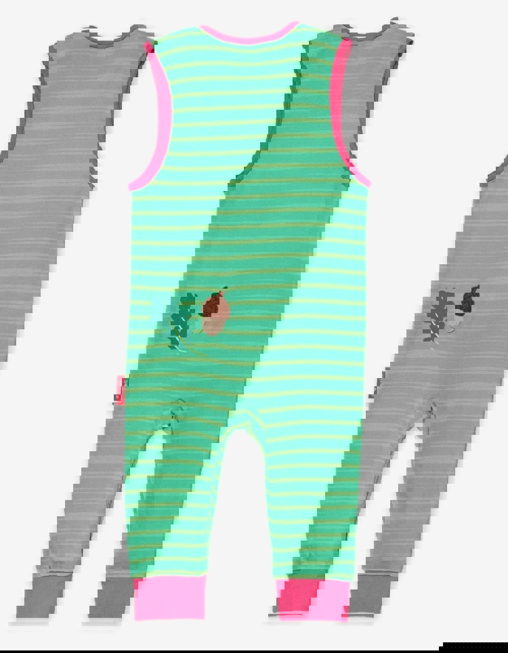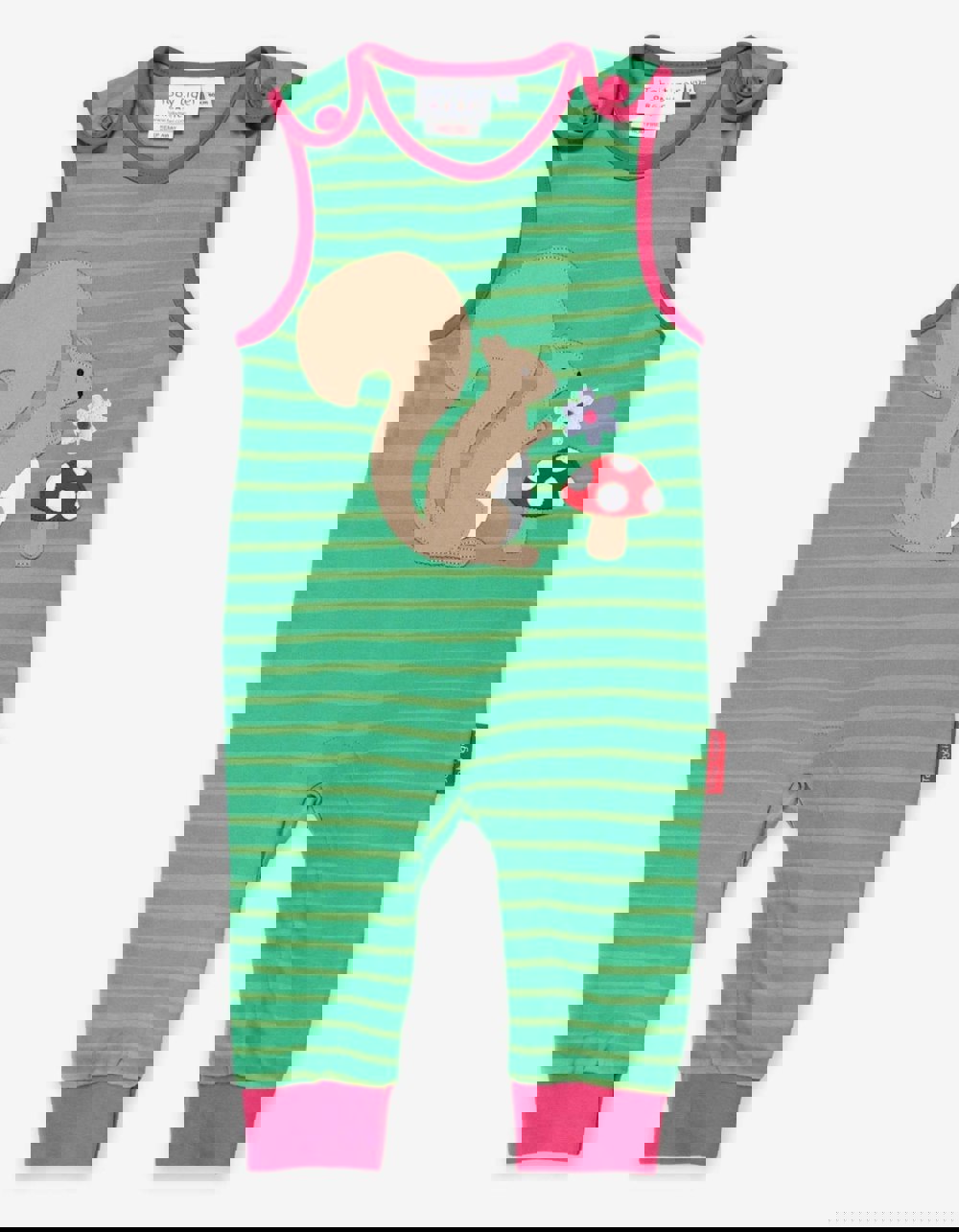 Keep it casual with these super comfy, organic slouchy dungarees - slungarees! Our big and bushy tailed squirrel applique is pride of place on our soft-as-can-be green stripes, while the smart pink trim adds extra style. With our Organic Squirrel Applique Slungarees, you'll rock both comfort and charm. Whether you're chasing after those pesky acorns or lounging around, our buttery soft green stripes and trendy pink trim will have you looking and feeling your best. With the stylish addition of our quirky bushy-tailed squirrel applique, you'll be the talk of the town (or the forest). Don't compromise style for comfort, have both with our slungarees! Love this look? Check out our Forest Adventure organic childrenswear collection online at Toby Tiger.