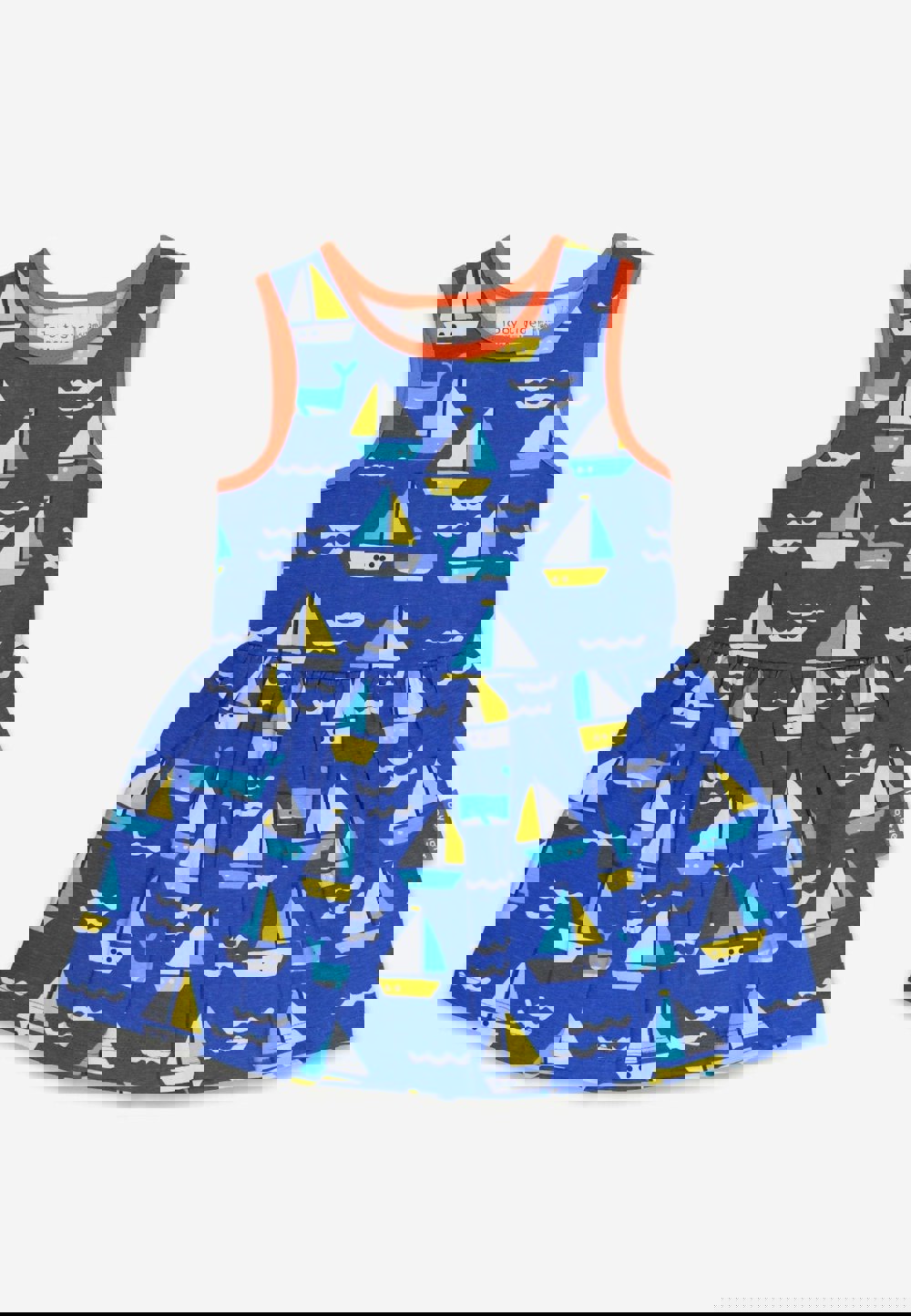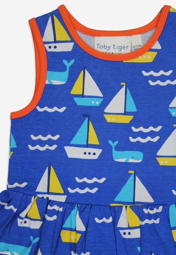 Get ready to twirl in the Organic St Ives Print Summer Dress! With a unique Toby Tiger design, this soft and comfortable blue jersey dress features a playful boat and whale print, bright orange trim, and a full twirly skirt. Made from 100% GOTS-certified organic cotton and environmentally friendly AZO-free dyes. Available in sizes 12 months to 8 years old. (Machine washable at 30 degrees. )