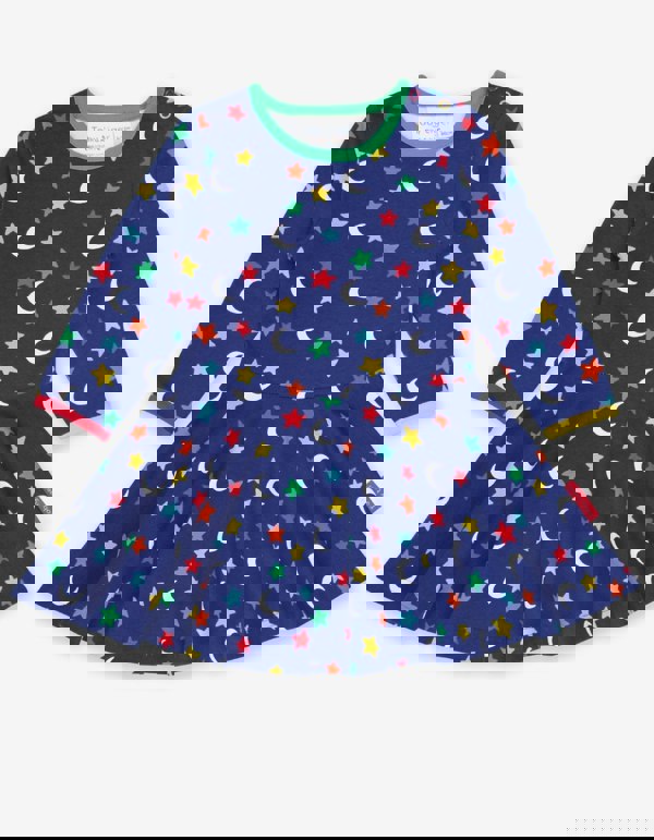 Swirl and twirl among the stars in this fab and floaty organic skater dress. Made from super soft 100% certified organic cotton featuring long sleeves, it'll keep little ones warm all winter. We've added neck poppers on sizes 6-12 months and 1-2 years for fuss-free changing.
