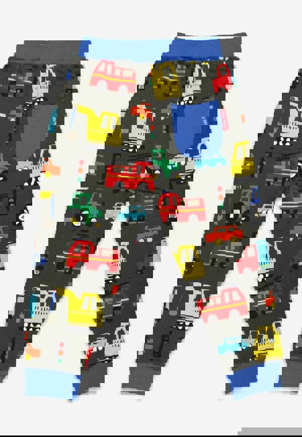 Get ready for a journey in style with our Organic Transport Print Joggers. In a playful dark grey, these joggers are adorned with a parade of colourful transportation figures including traffic lights, cars, and even a fire engine! Made with organic materials, these joggers are perfect for little ones who love all modes of transport.
