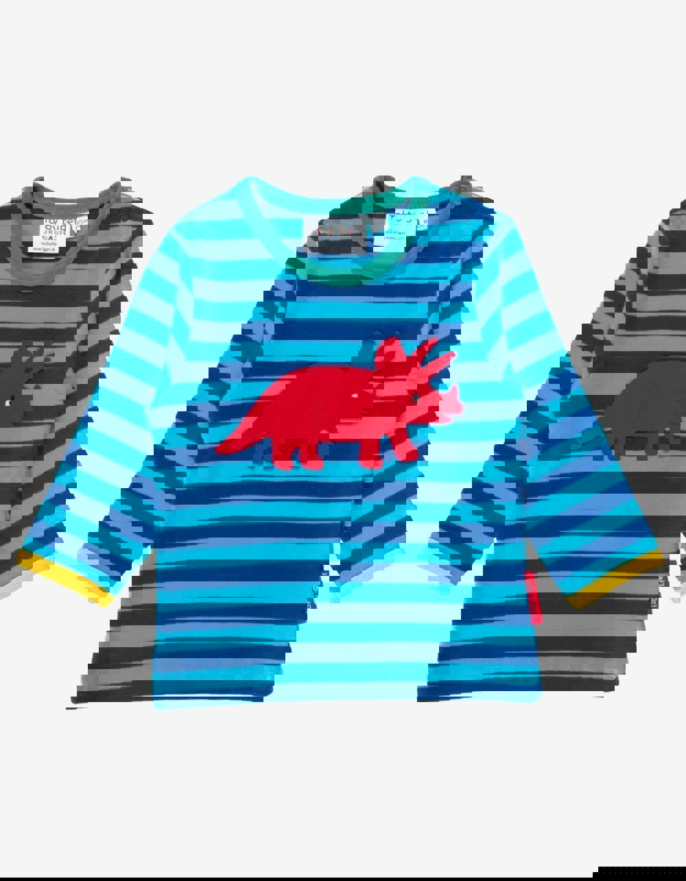 Watch out, Mr Triceratops is about! No spikes here, though, just super-duper cosiness on this super soft organic long-sleeved T-shirt. Fab stripes and contrasting colourful trim adds lots of style, while stress-free changing is yours thanks to neck poppers on smaller sizes. Don't forget to pay a visit to our entire Dinosaur collection online at Toby Tiger.