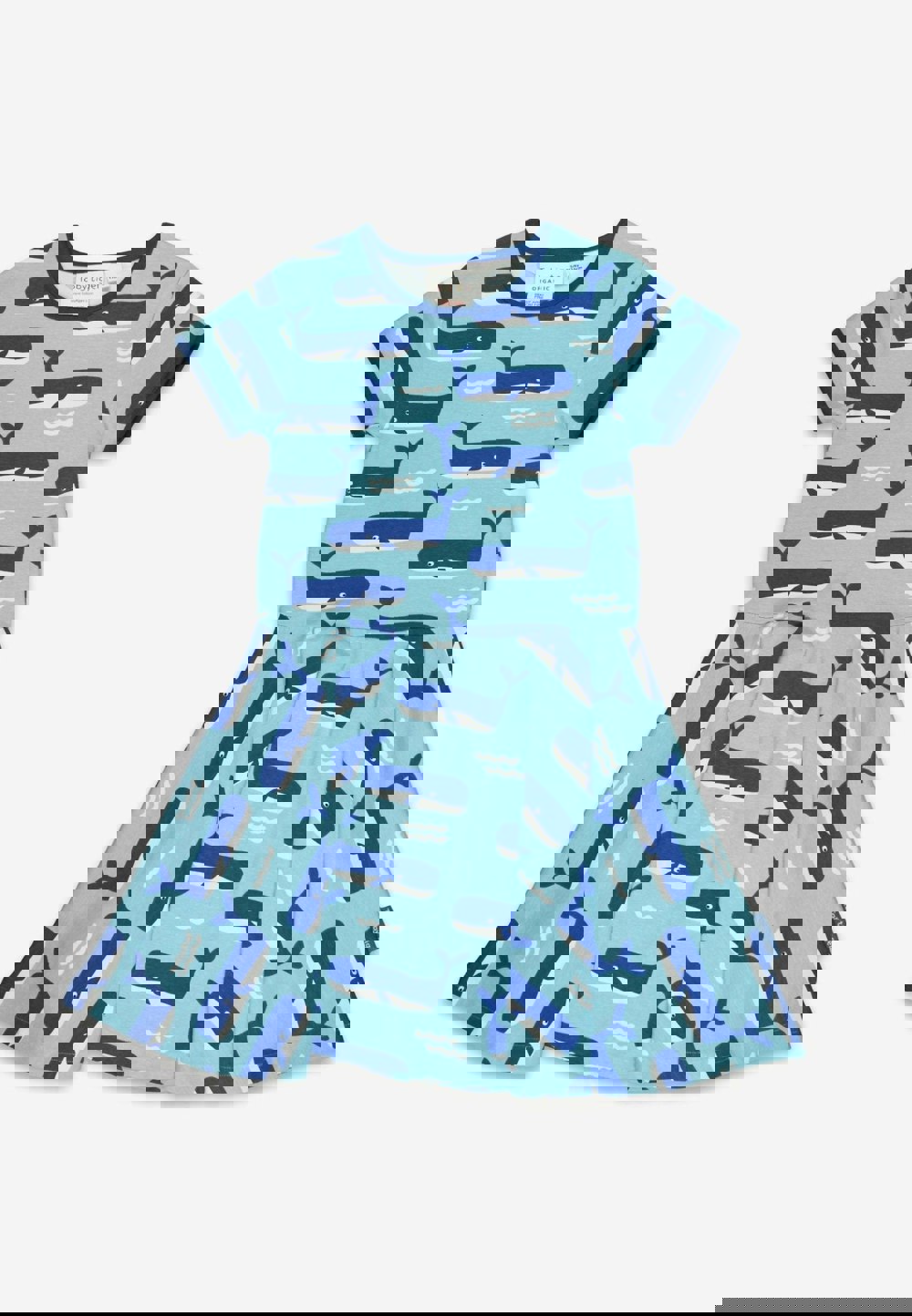 Get ready for a whale of a good time with this unique Organic Whale Waves Print Dress! Made with 95% GOTS-certified organic cotton and environmentally friendly dyes, it's as soft as it is stylish. Perfect for toddlers and kids, the full twirly skirt will have them dancing with joy. Machine washable for easy care. Available in sizes 18 months to 8 years old.