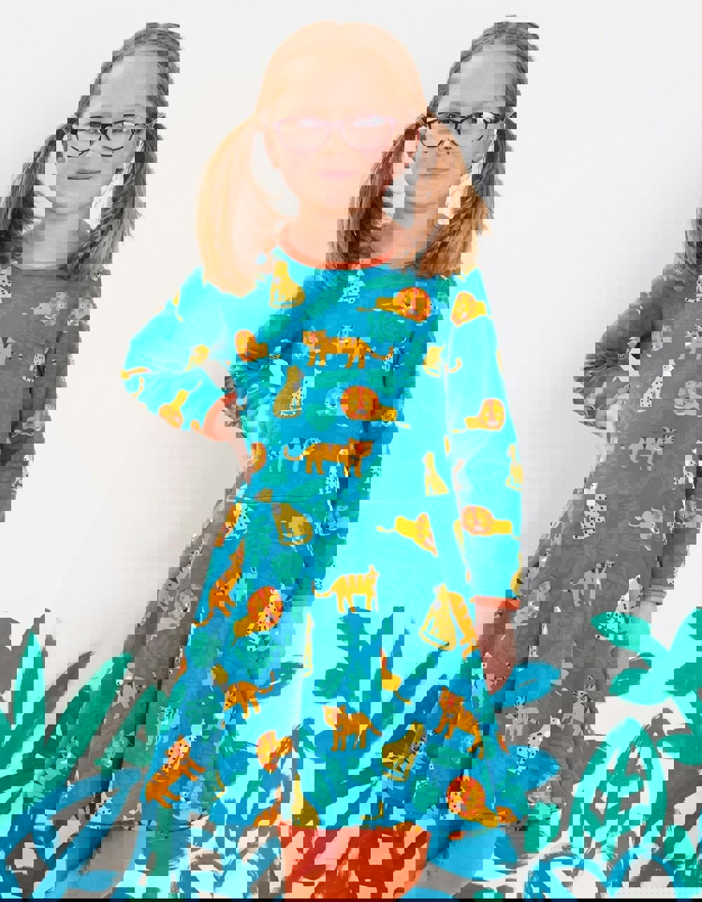 The big cats are nestled among the leaves, ready for anything - just like your little cub will be in this stylish applique T-shirt dress. Long sleeves and cosy two-tone green cotton keep little ones warm, while you can dress it up a little more with our organic leggings from our Basics range. Love this look? Check out our Wild Cats organic childrenswear collection online at Toby Tiger.