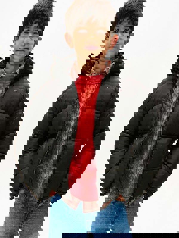 This boys essential down puffer jacket by Tommy Hilfiger comes in black with a down-filled construction and a nylon outer. A non-removable hood and zip-thru front keep the design clean and practical, while elasticated cuffs add a secure finish.