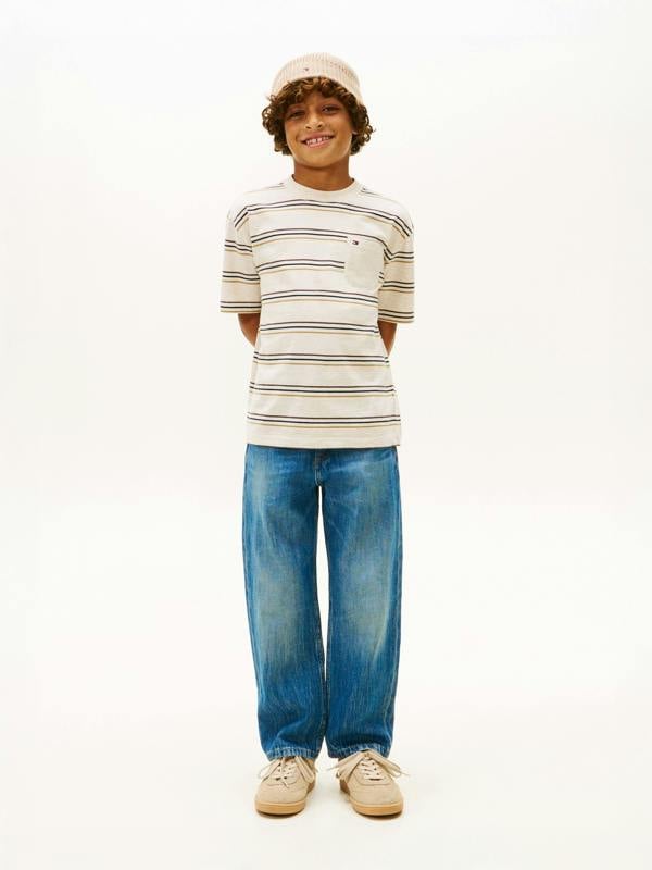 Tommy Hilfiger boys heather stripe T-shirt in beige. A simple wardrobe staple with a striped finish and a neutral colour that works across everyday outfits. The clean design keeps the focus on the heather stripe pattern, making it easy to pair with a range of looks.