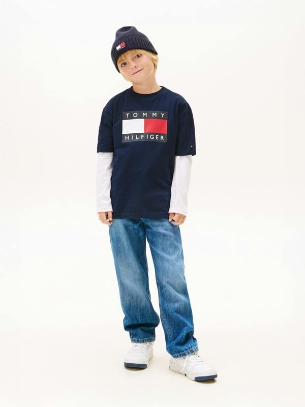 Tommy Hilfiger Boys Heritage Printed Flag T-Shirt in navy brings a signature look to everyday outfits. The front carries the iconic Tommy Hilfiger flag print, keeping the design rooted in the brand’s heritage. Finished in a classic navy colourway, it offers a clean, versatile option for casual wear.
