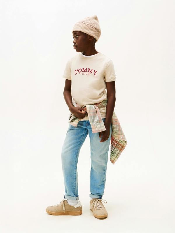 Tommy Hilfiger boys monotype print graphic T-shirt in beige for SS2026. This short-sleeved tee has a monotype graphic print for a clean, modern look.