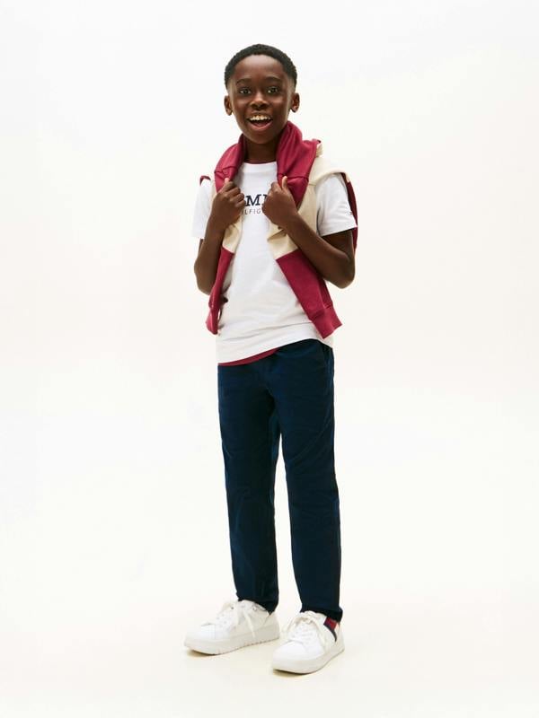 Tommy Hilfiger boys monotype print graphic T-shirt in white for Spring/Summer 2026. The front graphic uses a monotype-style print, finished with Tommy Hilfiger logo branding.