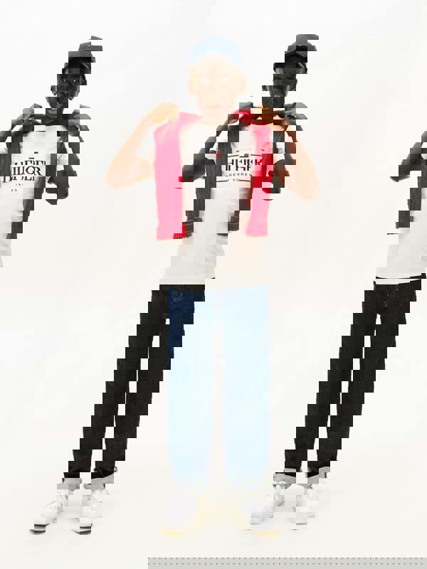 This Tommy Hilfiger boys Tommy Icons interlock T-shirt comes in ivory for a clean, neutral look. Made in interlock material, it offers a durable finish with comfort for everyday wear. A Tommy Hilfiger logo sits on the design, adding a clear branded detail.