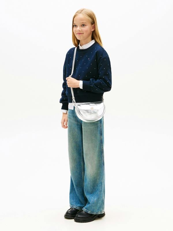 The Tommy Hilfiger Girls Festive Crossbody Moon Bag is a compact accessory designed to carry everyday essentials in style. Finished in silver, it brings a standout look to festive outfits and special occasions, while the moon bag shape keeps the silhouette modern and easy to wear.