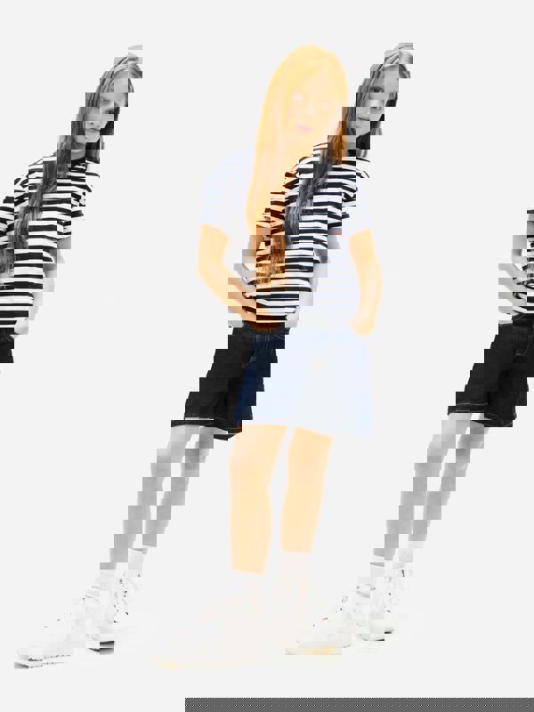 The Tommy Hilfiger Girls Striped Cotton T-Shirt in navy is a versatile addition to her everyday wardrobe. Designed with a classic striped pattern, it offers a timeless look that works well for a range of outfits and occasions.