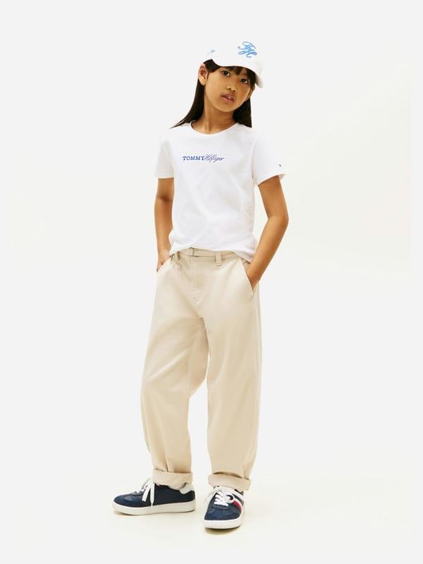 The Tommy Hilfiger Girls Tommy Script T-Shirt in white is a stylish choice for everyday wear. Designed for the SS2026 season, it features a playful Tommy Script print that adds a distinctive finish to casual outfits. Made in Bulgaria, this piece is crafted with comfort in mind, making it easy to wear across a range of occasions.