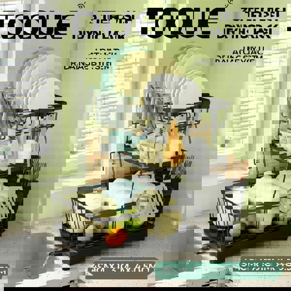 Say goodbye to messy countertops with this toque 3 tier dish drying rack a stylish and practical solution for any kitchen. Designed for families small kitchens or busy households this black dish drainer rack offers ample space to air dry plates bowls glasses mugs utensils and more. With a sleek finish and modern structure it's perfect for maximising your counter space while keeping your kitchen organised.