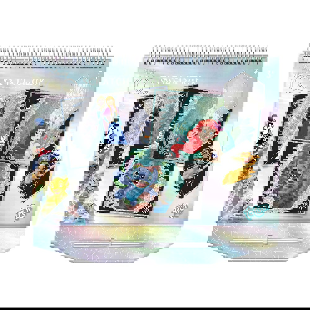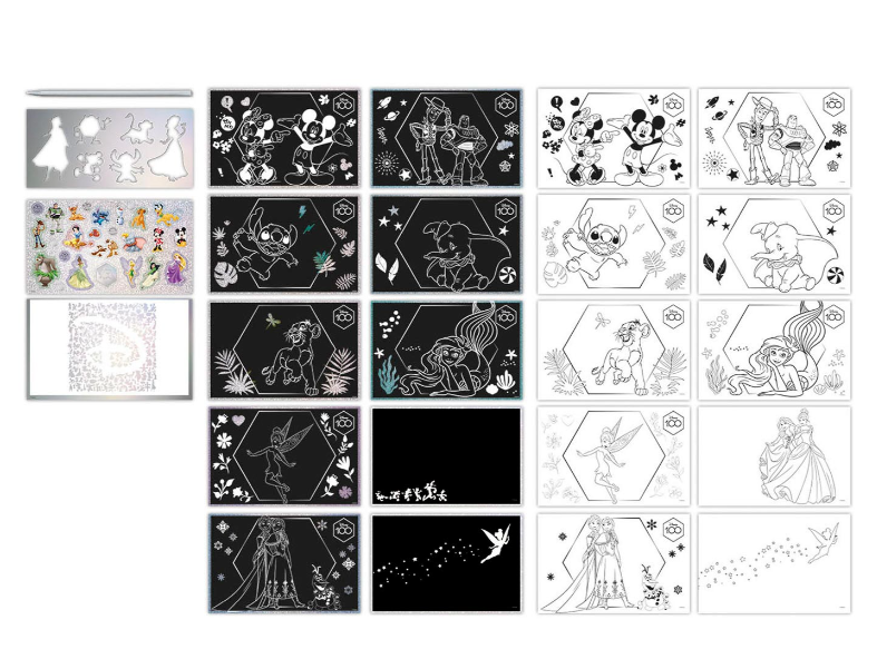 The Disney 100 years of wonder scratch book unleashes creativity for kids. Create 10 luxury glittering scratch cards including 11 colouring pages, stickers, background and scratch pen.