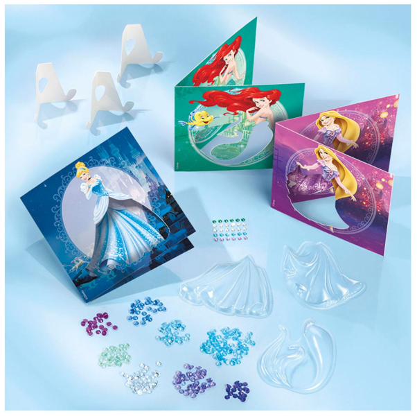 Contains 3 brilliant shake cards of which you can fill the 3D dresses of the princesses with different coloured diamonds.