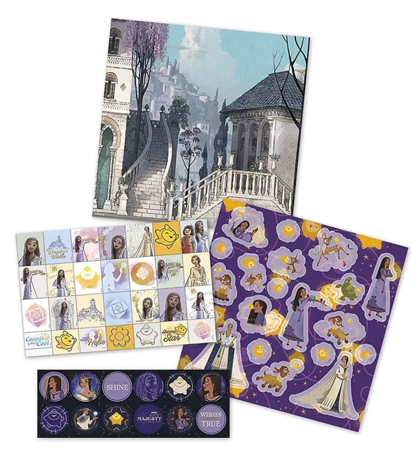 Totum Disney Wish Sticker Set conisting of 3 sheets of vasious shaped stickers and scenery board, is designed based on the newest 2D Disney animation film, fairy tale fantasy and musical comedy and produced by the Walt Disney Animation Studios, the makers of Frozen 1 and 2, Lion King and many more success movies directed by Oscar winning Chris de Buck.