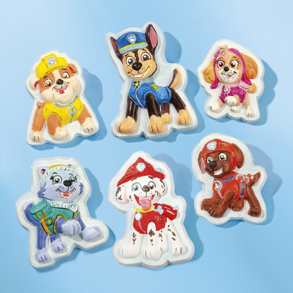 Start painting and let the creativity flow, Make 6 Paw Patrol plaster pups and paint them with 6 colour of paint and brush incl. measuring cup