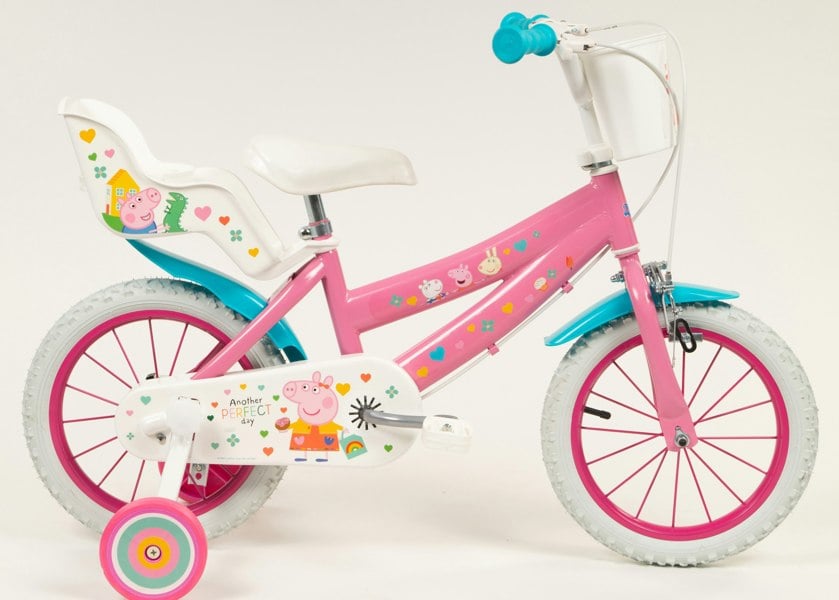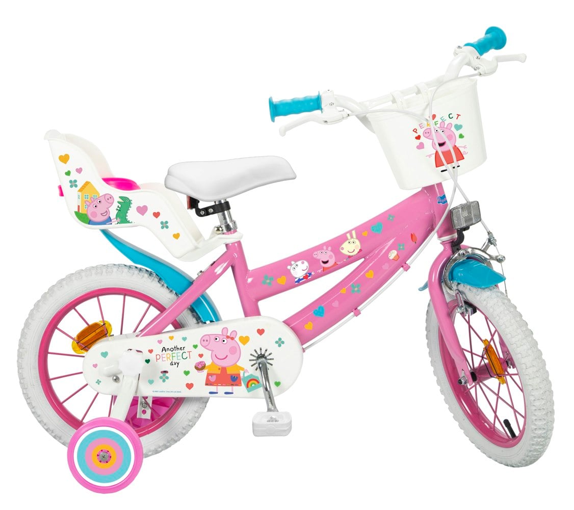 Little Peppa Pig fans can ride in style on the Peppa Pig 14″ Bicycle – Pink. This charming bike is adorned with colourful Peppa Pig graphics, making it an exciting choice for young riders. It features a robust steel frame for durability and comes equipped with removable stabilisers to help children build confidence as they learn to balance and pedal independently. The front and rear calliper brakes ensure reliable stopping power for safety. This Peppa Pig 14″ Bicycle – Pink also includes a front basket, perfect for carrying small toys or essentials, and a rear doll carrier, so a favourite companion can join in on the adventures. With an adjustable saddle and handlebars, this bicycle can grow with your child.