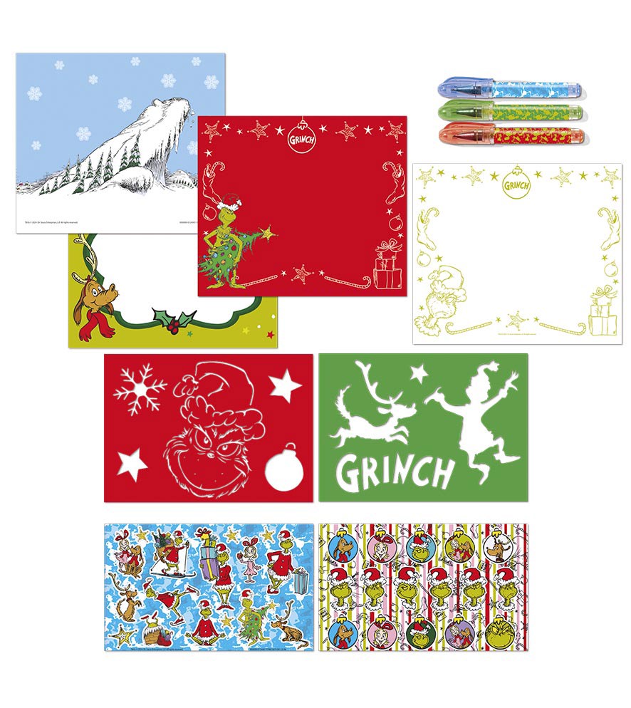 This activity book comes with 2 stencil sheets, 2 sheets of stickers featuring The Grinch, 3 play scenes, 20 inner sheets, and 3 gel pens.