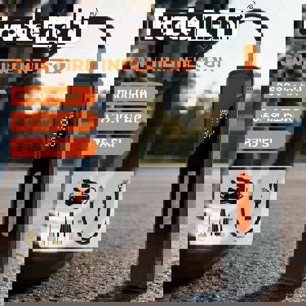 The Traderight mini car tyre inflator delivers fast and accurate inflation for cars bicycles motorbikes and sports balls. Built with a durable ABS body and compact 24. 5cm×6cm×5. 5cm design it uses a 60W motor and 19mm cylinder to reach up to 150PSI with 20L/Min airflow. The bright LED screen displays PSI KPA BAR and KG/CM² while four preset modes and memory function ensure quick and convenient use. A top LED light provides emergency visibility at night and the Type-C port supports easy recharging. Supplied with a 3m car charging cable hose five nozzles and a storage bag for everyday use.