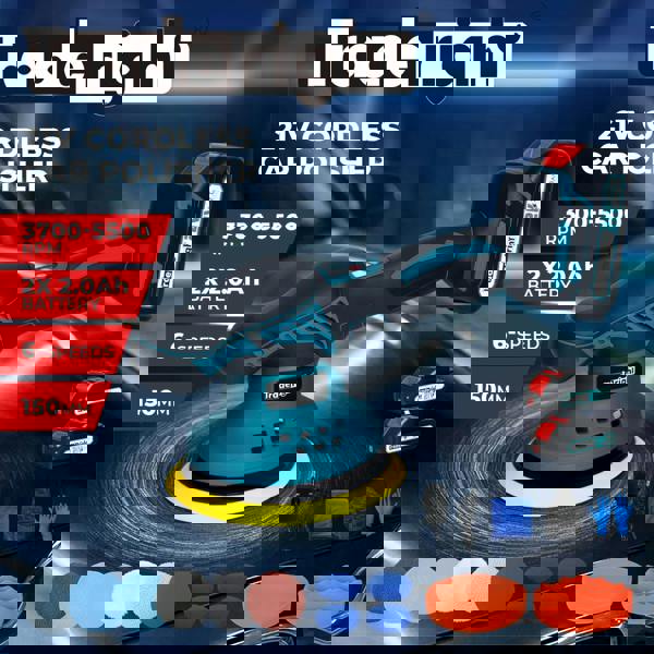 Traderight cordless car polisher Kit lets you polish anywhere without cords. Powered by two 21V 2. 0Ah lithium batteries and a durable brushless motor it delivers up to 5500 RPM for fast swirl-free results. The 6-inch pad with 9mm orbit ensures smooth performance on cars bikes furniture and metal surfaces.