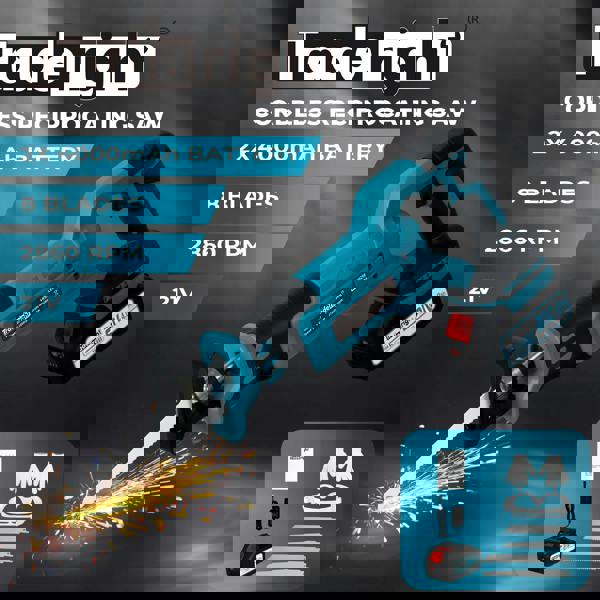 With a tool-free attachment change system and an ergonomic anti-slip rubber handle this reciprocating saw provides superior comfort control and safety during extended use. It includes two 4. 0Ah lithium batteries a fast charger and essential safety gear such as goggles and gloves—everything you need for continuous high-performance cutting. The safety lock prevents accidental activation while the battery indicator ensures you’re always ready to work.