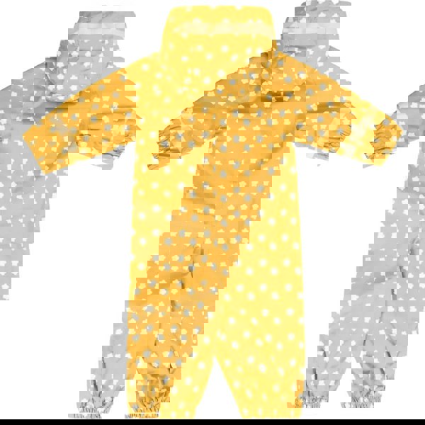 The Trespass Baby Showery Rain Suit in Honeybee is made from woven fabric with a PVC coating and an all-over print. A flower and logo design sits across the suit, finished with reflective trim for added visibility. The hooded neckline includes a grown on hood, and the long sleeves are completed with elasticated cuffs.