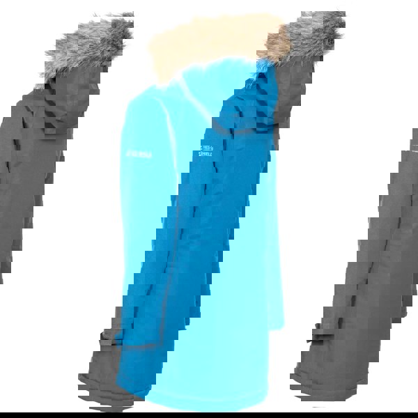This children’s girls Fame parka jacket from Trespass comes in cosmic blue with a longer length and lightly padded construction. The shell is made from 100% polyester PVC, with a 100% polyester lining and 100% polyester filling.