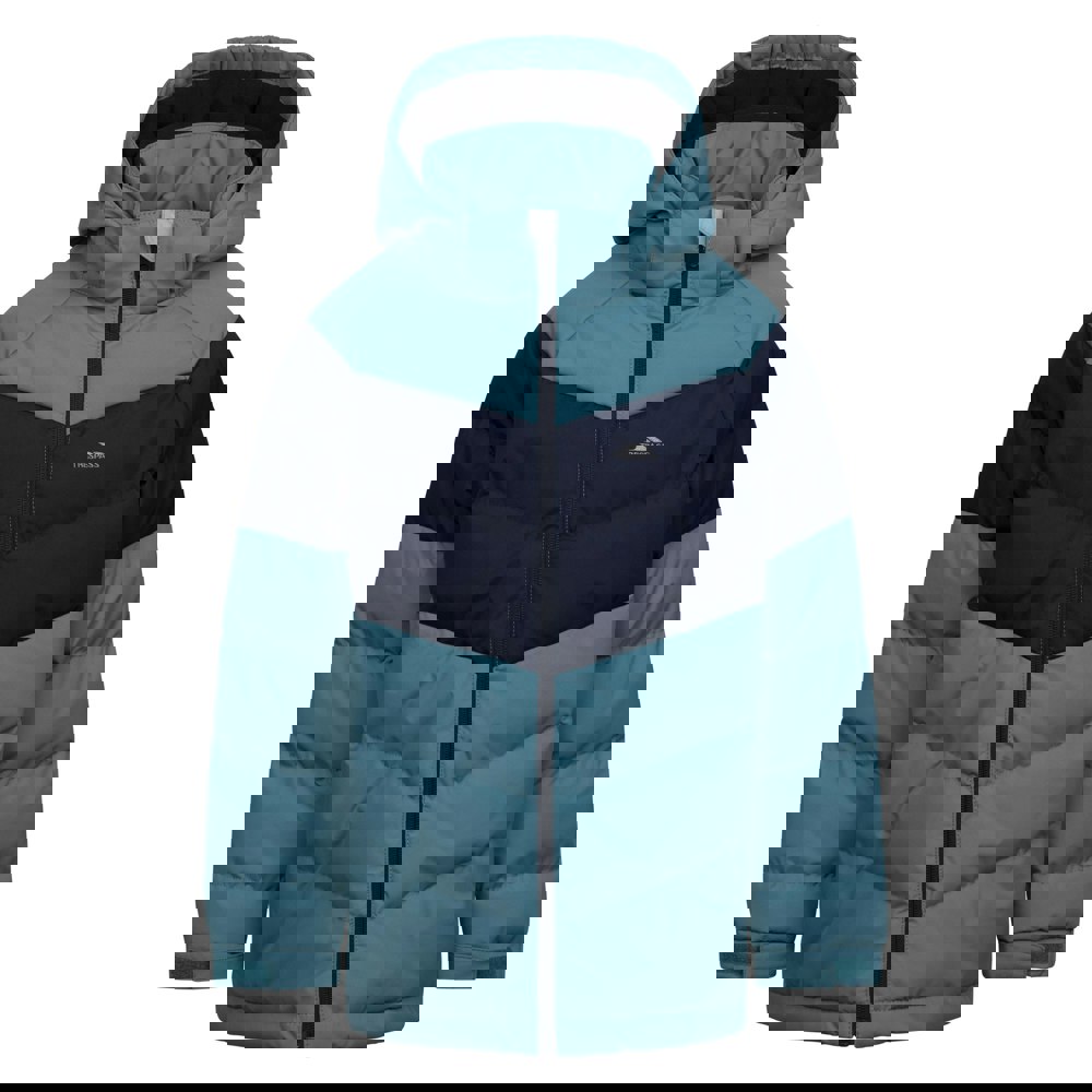 This padded jacket comes in light teal with a quilted finish, contrast panels and a logo detail. The outer is made from 100% polyester with a PVC coating, with a 100% polyester lining and 100% polyester filling. A hooded neckline and long sleeves create a practical shape, while the full zip fastening keeps the front clean and simple.