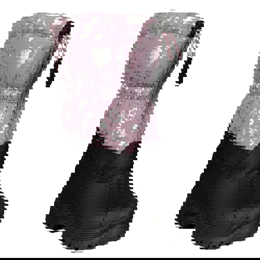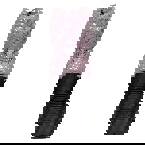 Trespass Bora snow boots for children come in a mauve colourway with a contrast colour printed design. The ankle-cut silhouette has a round toe and a flat profile. The upper combines PU (polyurethane) and textile, with a sherpa and textile lining.