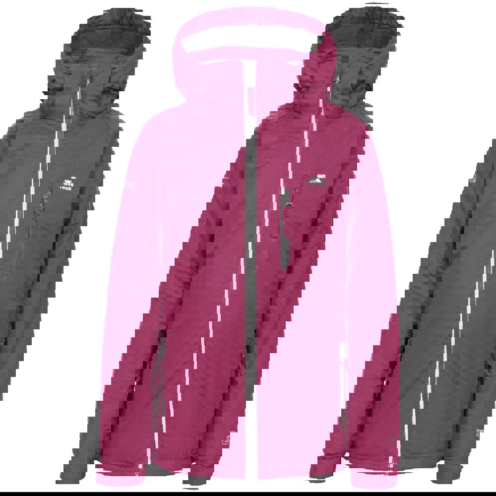 The Trespass Cornell II TP50 jacket for children is made from 100% polyester in a woven microfibre fabric with a PU coating. It has a plain finish with logo detailing, plus reflective detail and taped seams. The hooded neckline includes an adjustable hood that can be removed with studs, and the long sleeves are finished with adjustable, elasticated cuffs.