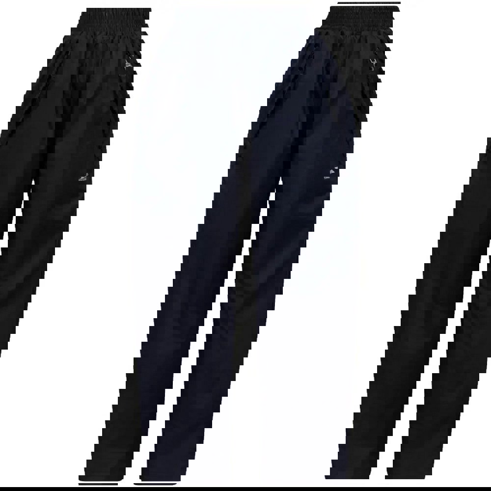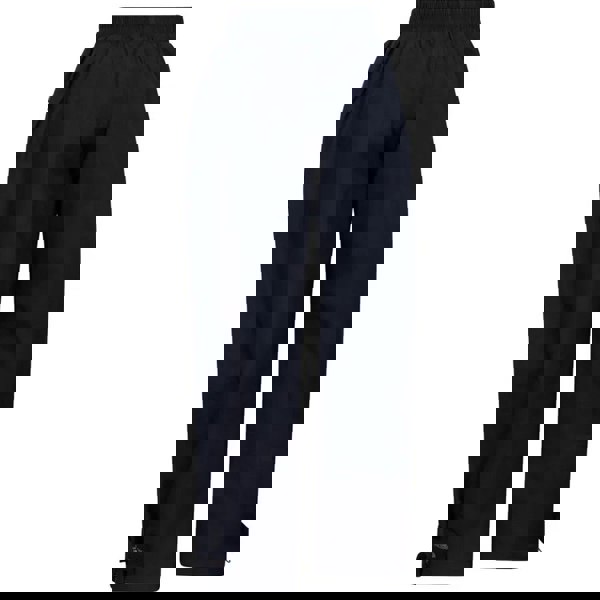 Trespass Echo waterproof trousers for children in navy with a plain finish and logo detail. The fabric technology includes breathable, waterproof and windproof properties, supported by taped seams. An elasticated waistline provides a secure fit, while two side pockets with zip fastening keep small items contained.
