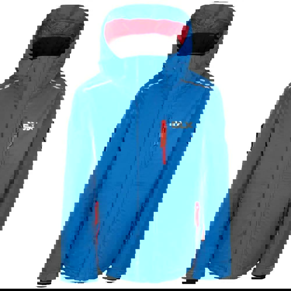 This children’s Gordy DLX ski jacket from Trespass comes in blue with contrast detail and a sleeve print with text. The shell combines polyester with a PU membrane, with a polyamide and polyester lining and down-touch polyester filling. A hooded neckline and long sleeves create a classic ski-jacket shape, with a detachable hood for adaptable wear.