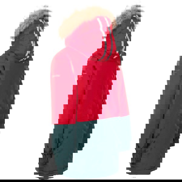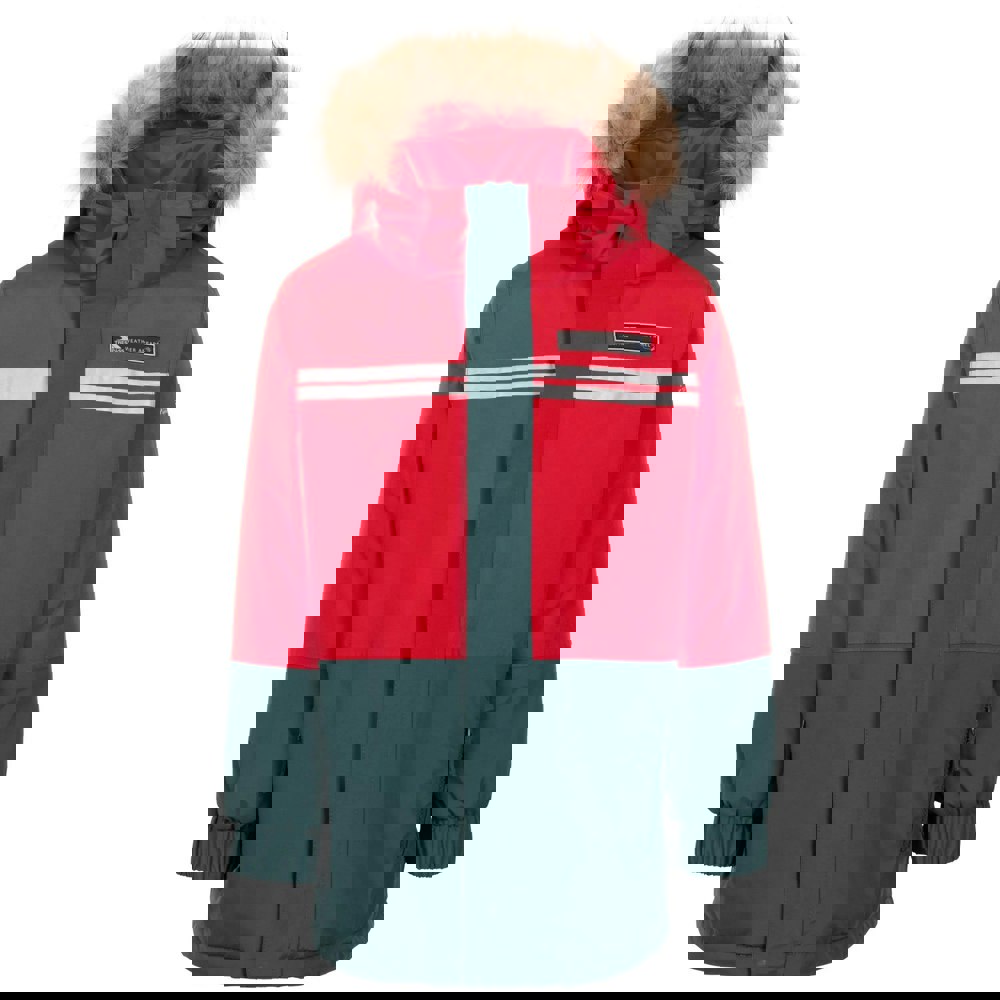 Waterproof and windproof fabric technology is paired with taped seams and reflective detail. The long-sleeved shape includes elasticated cuffs and a hooded neckline. The hood and faux fur trim detach for flexible wear, while a full zip fastening and stormflap provide secure closure. Two side pockets complete the layout.