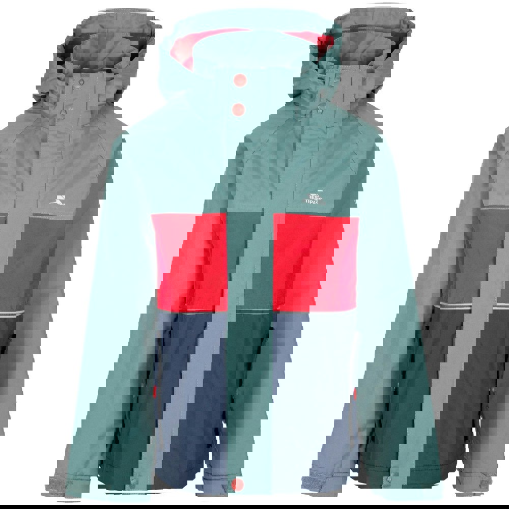 This children’s Ocean waterproof jacket from Trespass is made from 100% polyester with a PVC-coated woven fabric. It comes in spruce green with a colour block design, logo detailing and a branded sleeve. A standing collar and detachable hood provide adaptable coverage, while the long sleeves are finished with adjustable wrist straps and touch fastening tabs.
