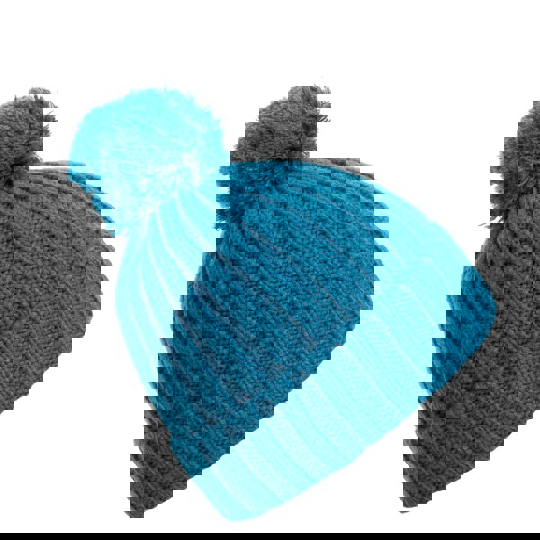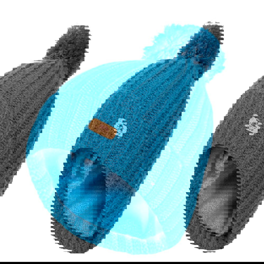 This children’s Thorns bobble hat comes in Bondi Blue with a knitted outer and a turned-up cuff. A bobble top and a leatherette badge complete the look, keeping the detailing simple and distinctive.